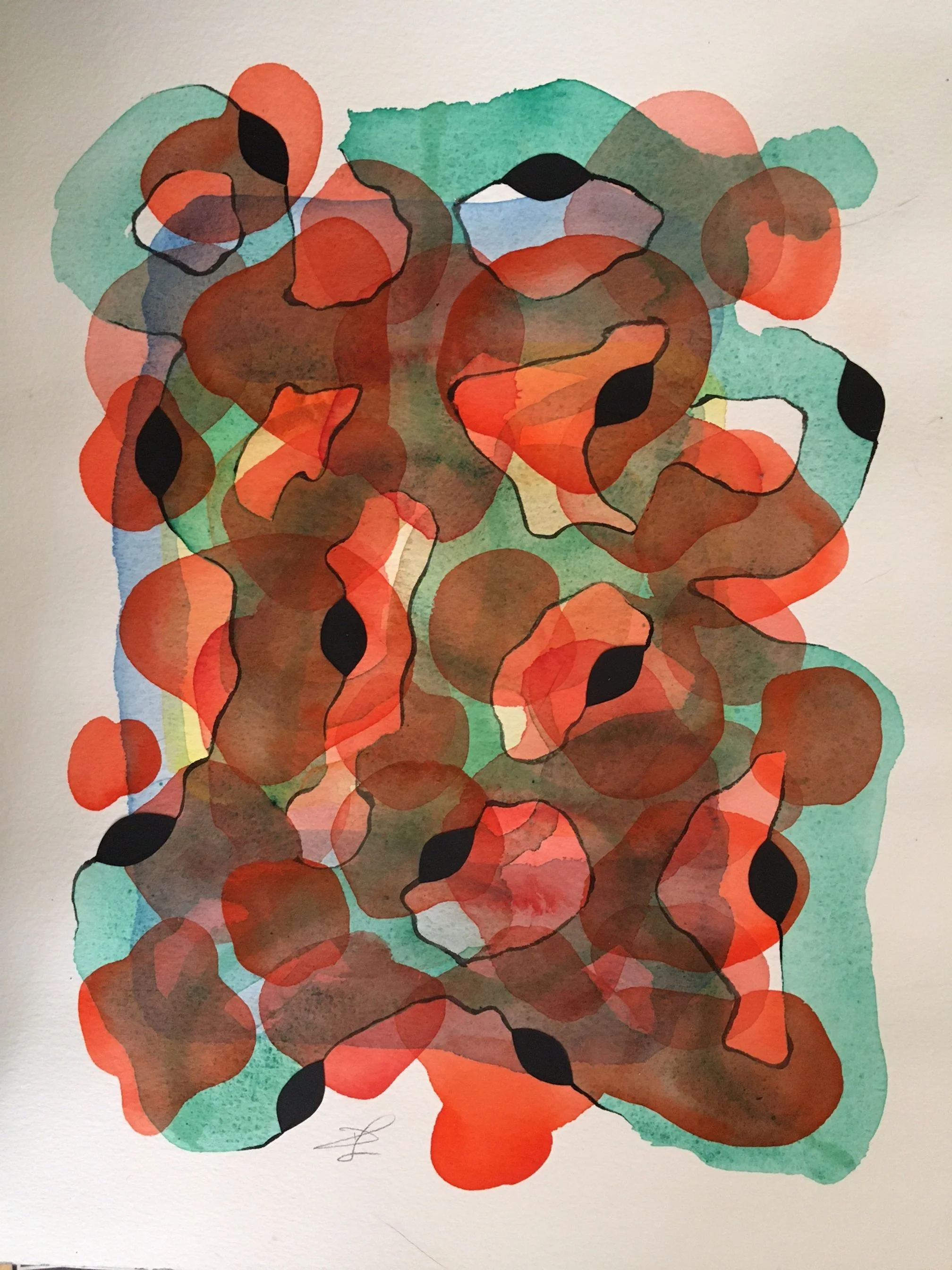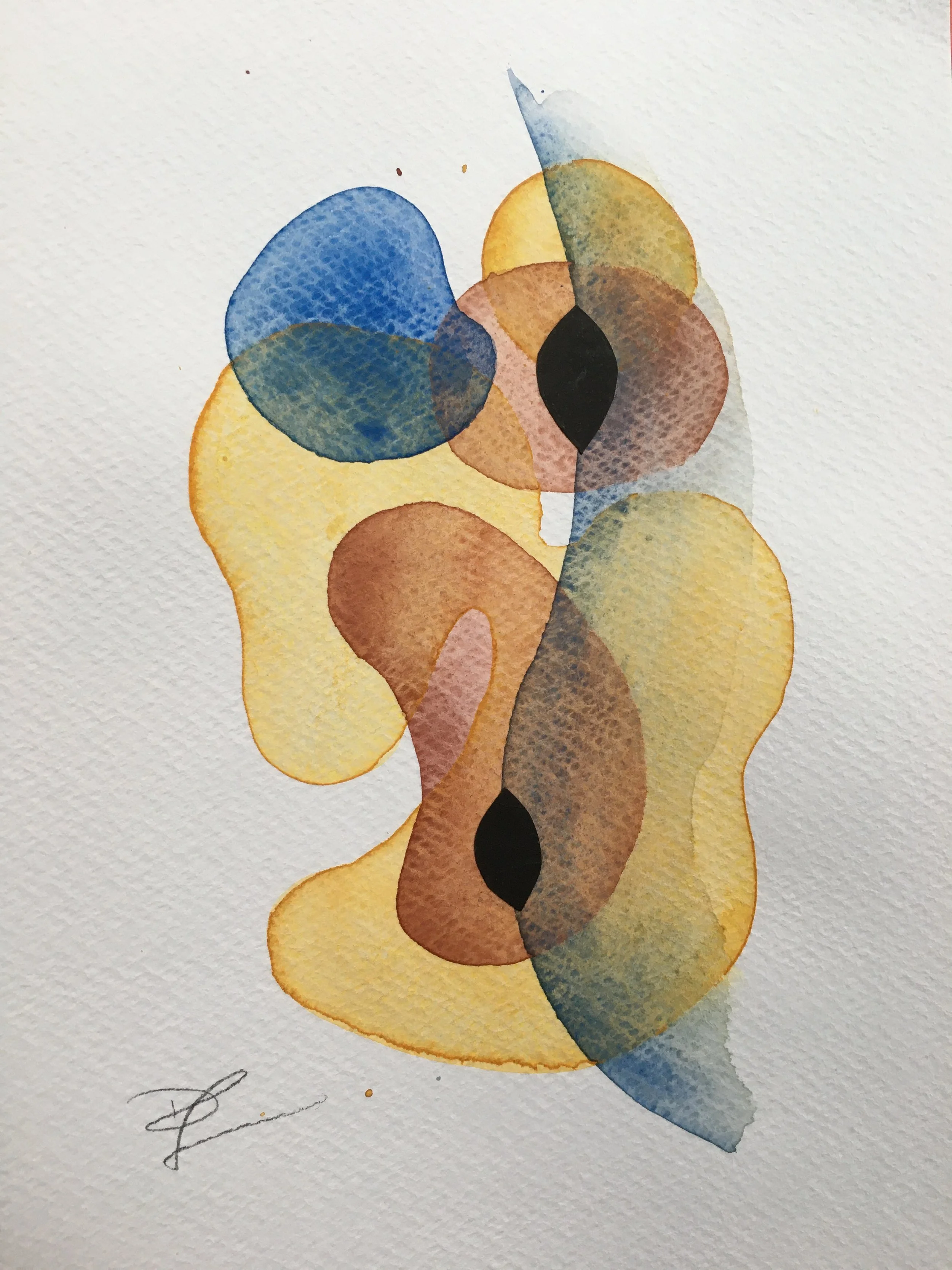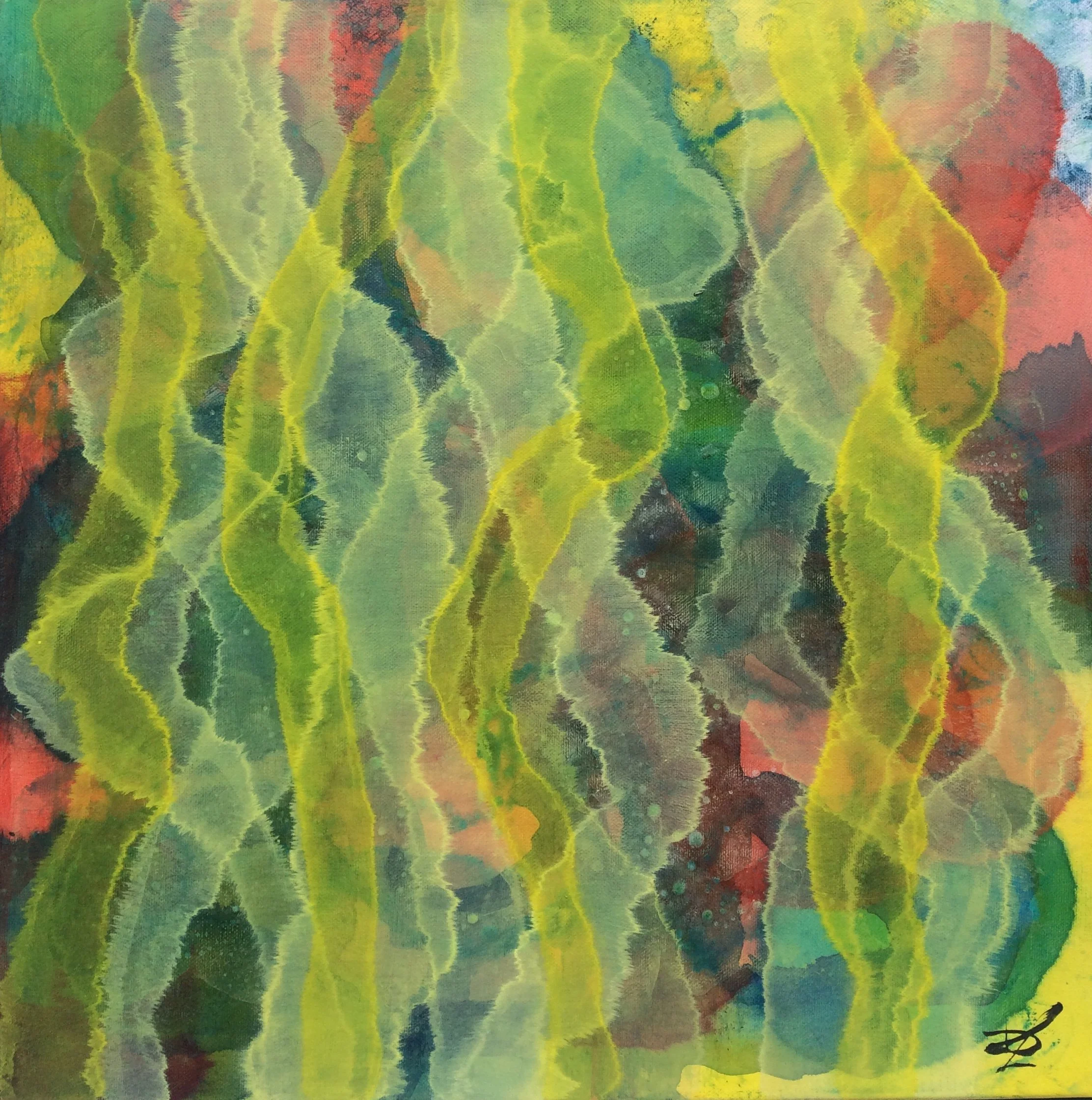 Ces algues que je peins représentent tout ce qui s’est imprimé en nous. Mes algues sont tantôt lianes, tantôt organiques, embrumées ou claires, ténébreuses ou joyeuses, à l’acrylique mais aussi à l’aquarelle.