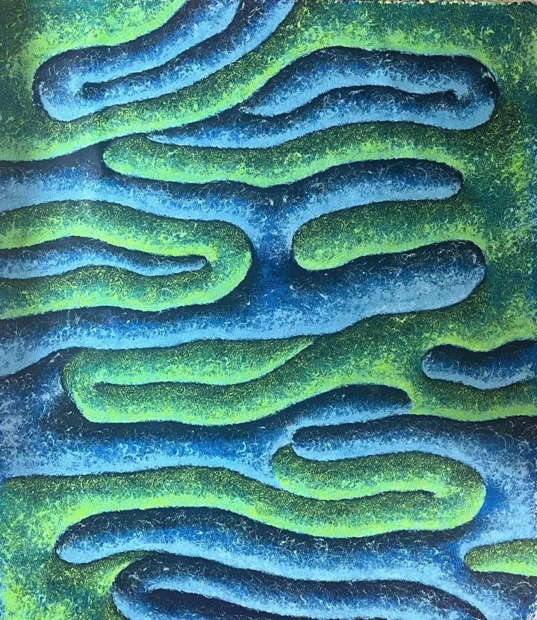 J’ai gratté la toile avec mes ongles. En formant des cercles à l’infini. Ca grouillait de vie ! Et puis ce geste… Une réminiscence d’enfance m’a traversée. Je retrouvais une sensation que je connaissais : les coupiches! Grand saut dans le passé auquel je ne m’attendais pas ! Que s’était–il passé pour avoir eu le besoin de peindre cet indicible ? Une manie de jeunesse qui m’est restée longtemps, je le confesse. Une manie vue nulle part ailleurs sur laquelle je ne me suis jamais interrogée, n’en retenant que l’absurde pour en sourire :